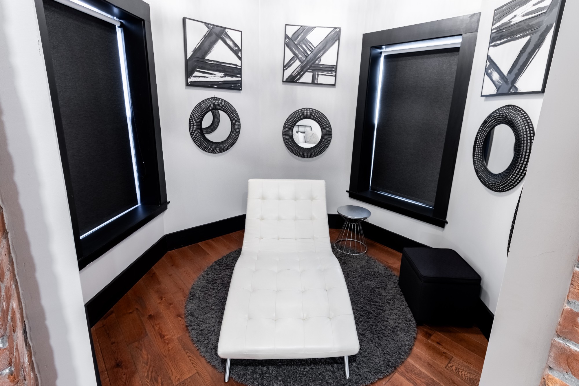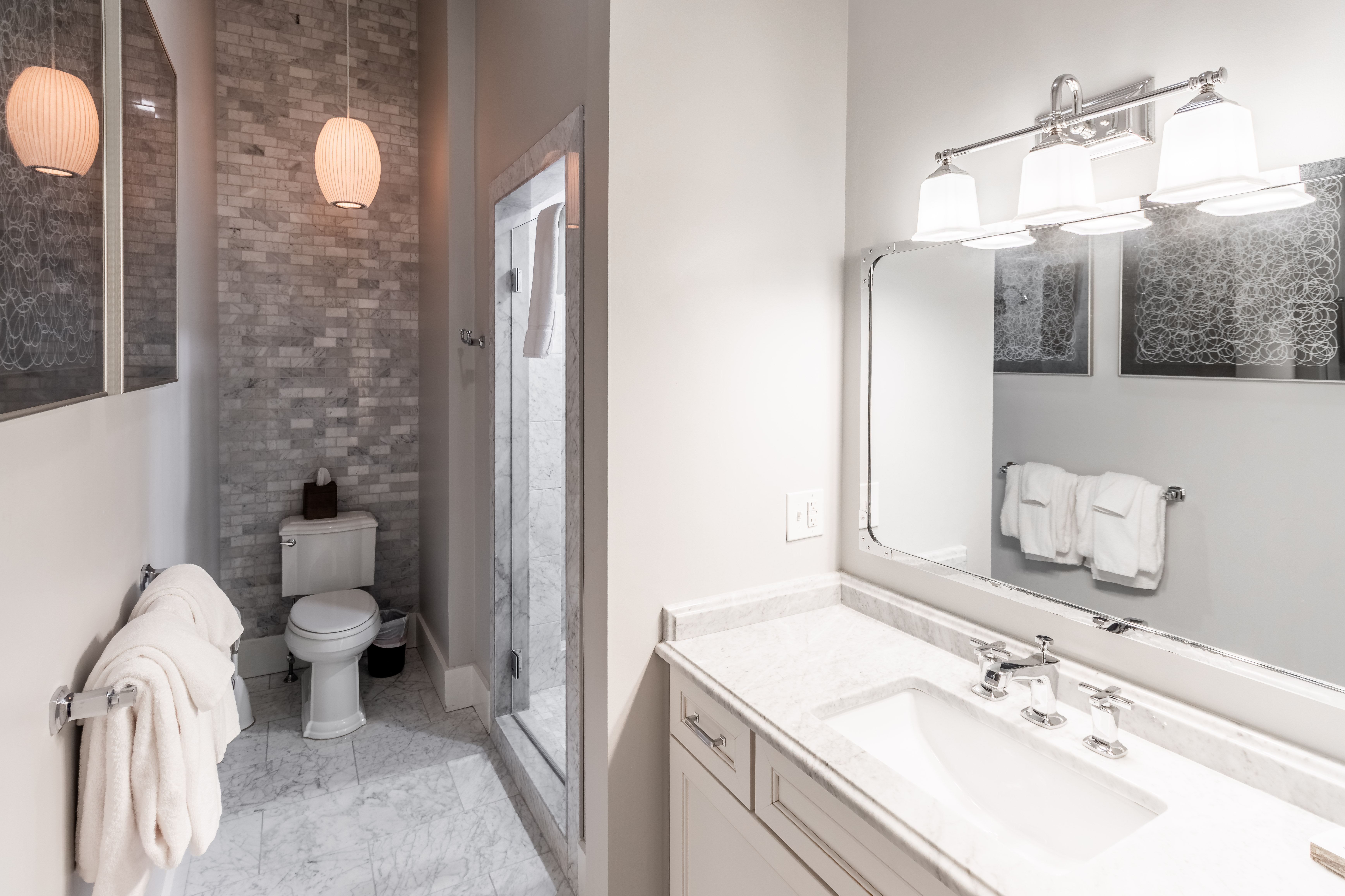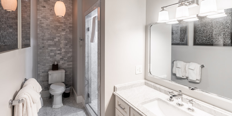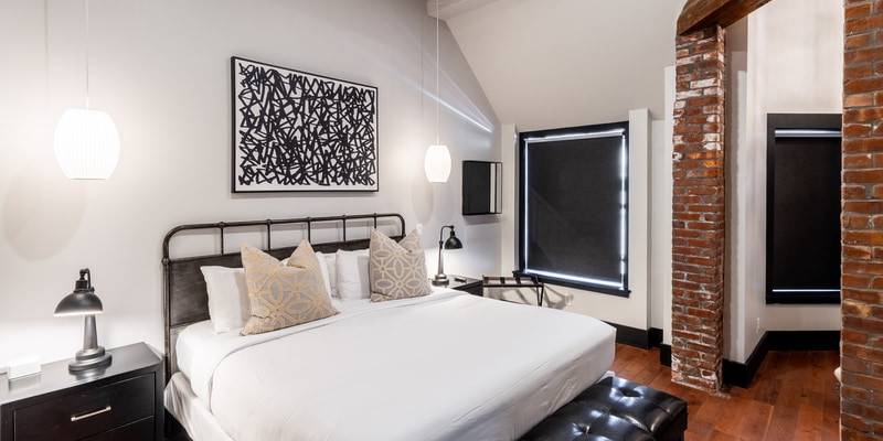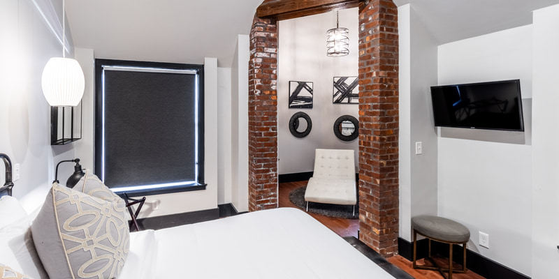 Room 5 is located on the second floor and features a king sized bed, a flat screen TV and an en-suite bathroom with walk-in shower. This room features a unique sitting area in The Firehouse's turret which was the original look out tower for Newport's Hose Co. 6.